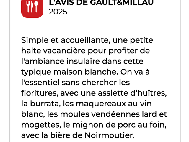 Simple et accueillante, une petite halte vacancière pour profiter de l'ambiance insulaire dans cette typique maison blanche. On va à l'essentiel sans chercher les fioritures, avec une assiette d'huîtres, la burrata, les maquereaux au vin blanc, les moules vendéennes lard et mogettes, le mignon de porc au foin, avec la bière de Noirmoutier.